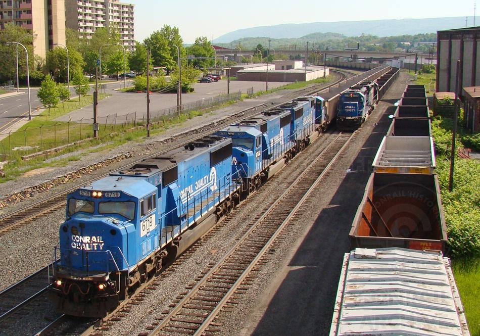 Former CR 5580 is the lead unit of a trio of blue SD60I's on a westbound PPLX coal train at Altoona, PA. A pair of helpers are also seen on the rear of an eastbound.