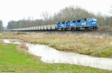NS 623 empty PPLX coal gons with NS 6728, 6725, & 6731 SD60Is heads west from Montour Power Plant.