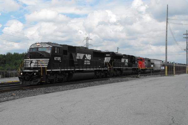 NS 537 empty hopper train with ex-CR assigned SD60Is heads west on the NS Watsontown Secondary past the debris of Herr's Mill demolition, completed earlier in the afternoon.