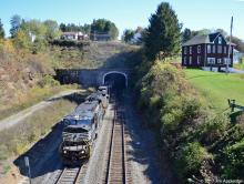 NS 7222 SD80MAC leader exits Allegheny Tunnel westbound with an empty hopper train.