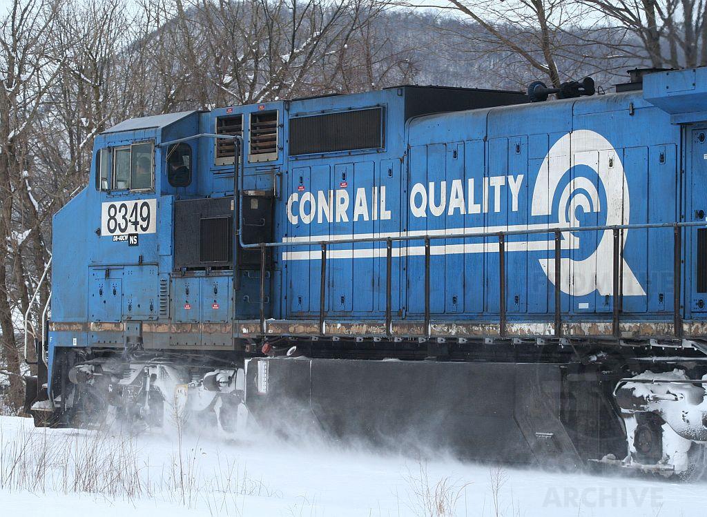 NS 8349 (ex CR 6109) 2-6-10 Marysville, PA. With 17" of snow on the ground, highway travel was out of the question. NS train I1M (extra 21M) former Conrail TVLA, is seen deadheading two additional crews to points west.