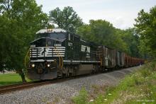 NS 8377 D8-40CW with NS 97Z rail train heads to the work area east of Susquehanna Trail crossing.