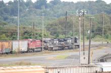 CP AC4400CW 9554 leads NS C40-8W 8420 (CR 6231) and C40-9W 9818 as they work Enola yard on August 25, 2014.