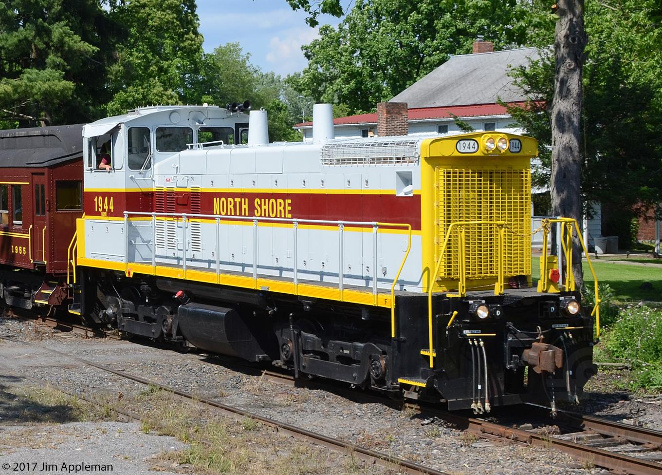 North Shore 1944 (PC/CR 9527, NS 2211) SW1500 running excursions with NSHR 1940 of SOU heritage on the other end of the train in pull-pull configuration from the ConAgra Brands Chef Boyardee plant across the river in Milton to north of the I-80 overpass at New Columbia for Milton's Bicentennial Week celebration. The track was former RDG/CR, now UCIR.