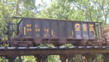 NYC 293074 is seen in the consist of CSX B801-03 at Harpers Ferry, WV on 9/3/16. Car was rebuilt from NYC 487232/CR 487232 in 3-01 by CSX's Raceland Shops. CR 487232 was built 12-78 by the N&W as a H1A class 3 bay hopper.