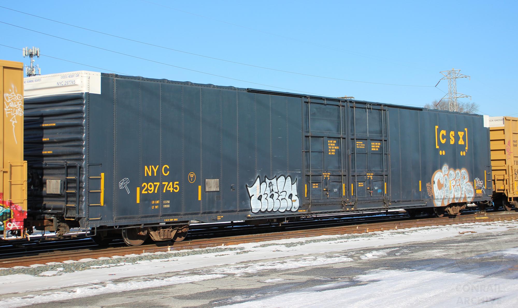 NYC 297745 is seen in the consist of CSX Q372-29 at Elsmere, DE on 1/30/22.Car is ex CR 297745 and was built 4-78 by Greenville Steel Car.