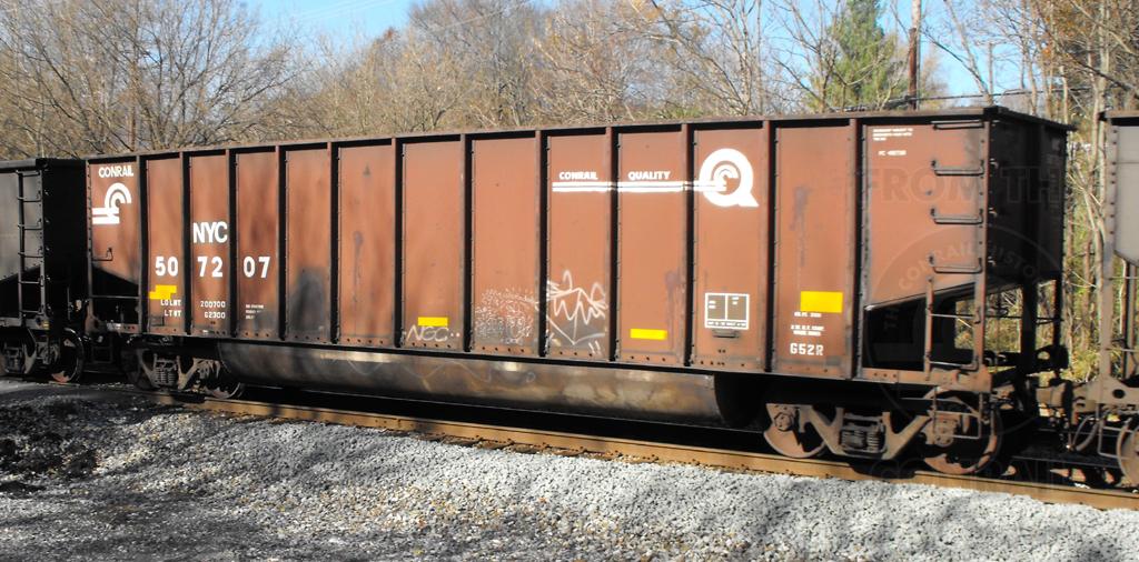 NYC 507207 is seen on U848-10 at Weverton MD on 11/12/11. Car is ex CR 507207 which was rebuilt from PC 482798, a former H43D class hopper.