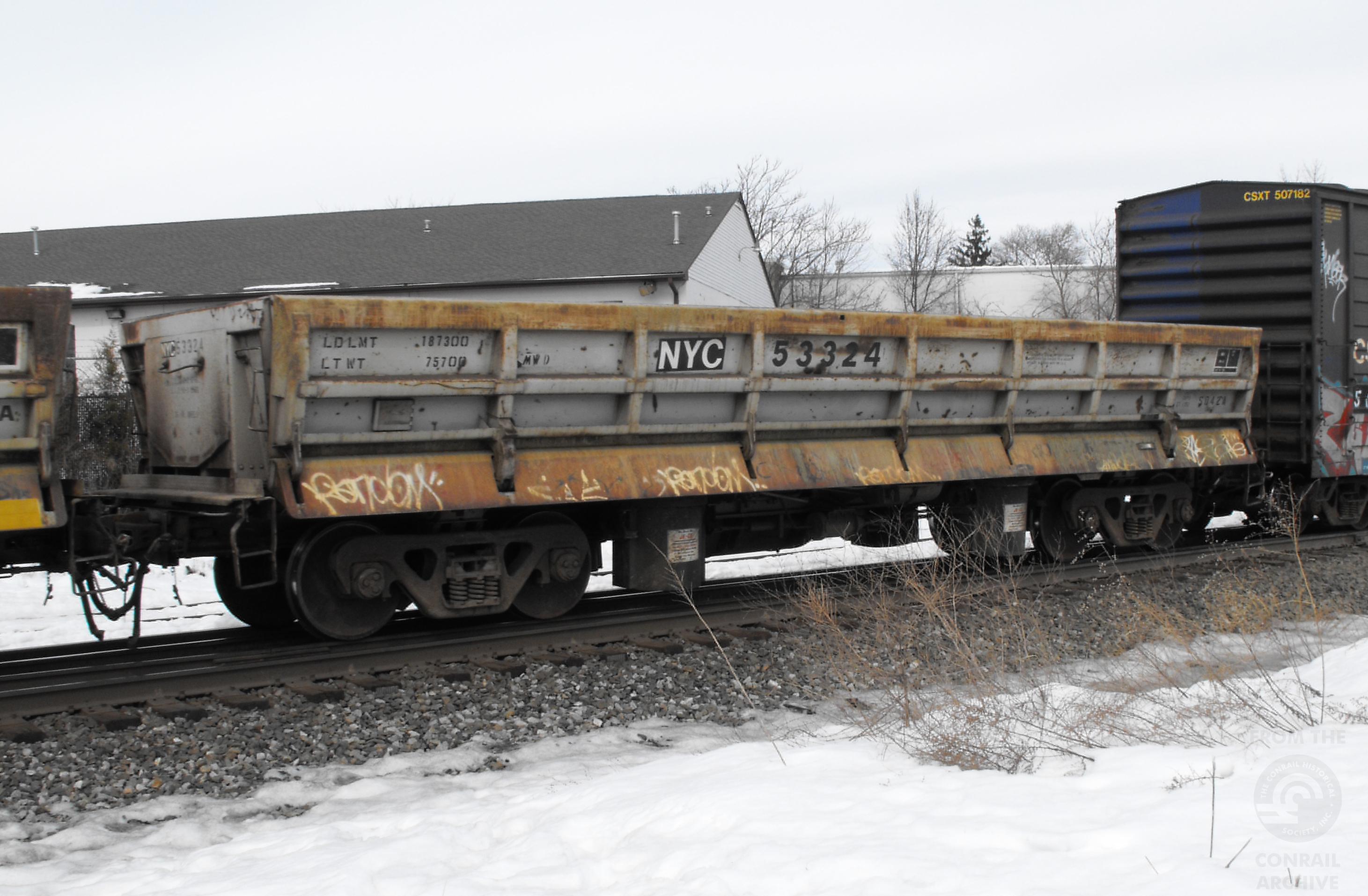 NYC 53324is seen in the consist of CSX Q373-19 at Elsmere, DE on 2/20/10. Car is ex CR 53324 and was built 3-78 by Difco.