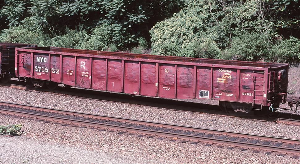 NYC 578632 is seen in loaded slab train PMT-11 at Johnstown, PA on 8/20/98. Car is ex CR 578632/RDG unknown as the car is wearing a number that was originally assigned to a former PRR G43 class gon.