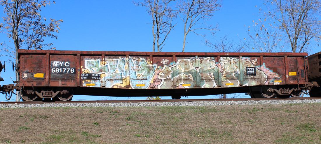 NYC 581776 is seen in the consist of CSX Q438-18 at Newark, DE on 11/20/15. Car is ex CR 581776 and was built 4-80 by CR.