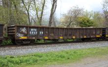 NYC 584829 is seen in the consist of CSX Q410-25 at Chichester, PA on 4/27/20. Car is ex CR 584829/PBNE 4069 and was built 7-80. Photo by Chris Carangi.