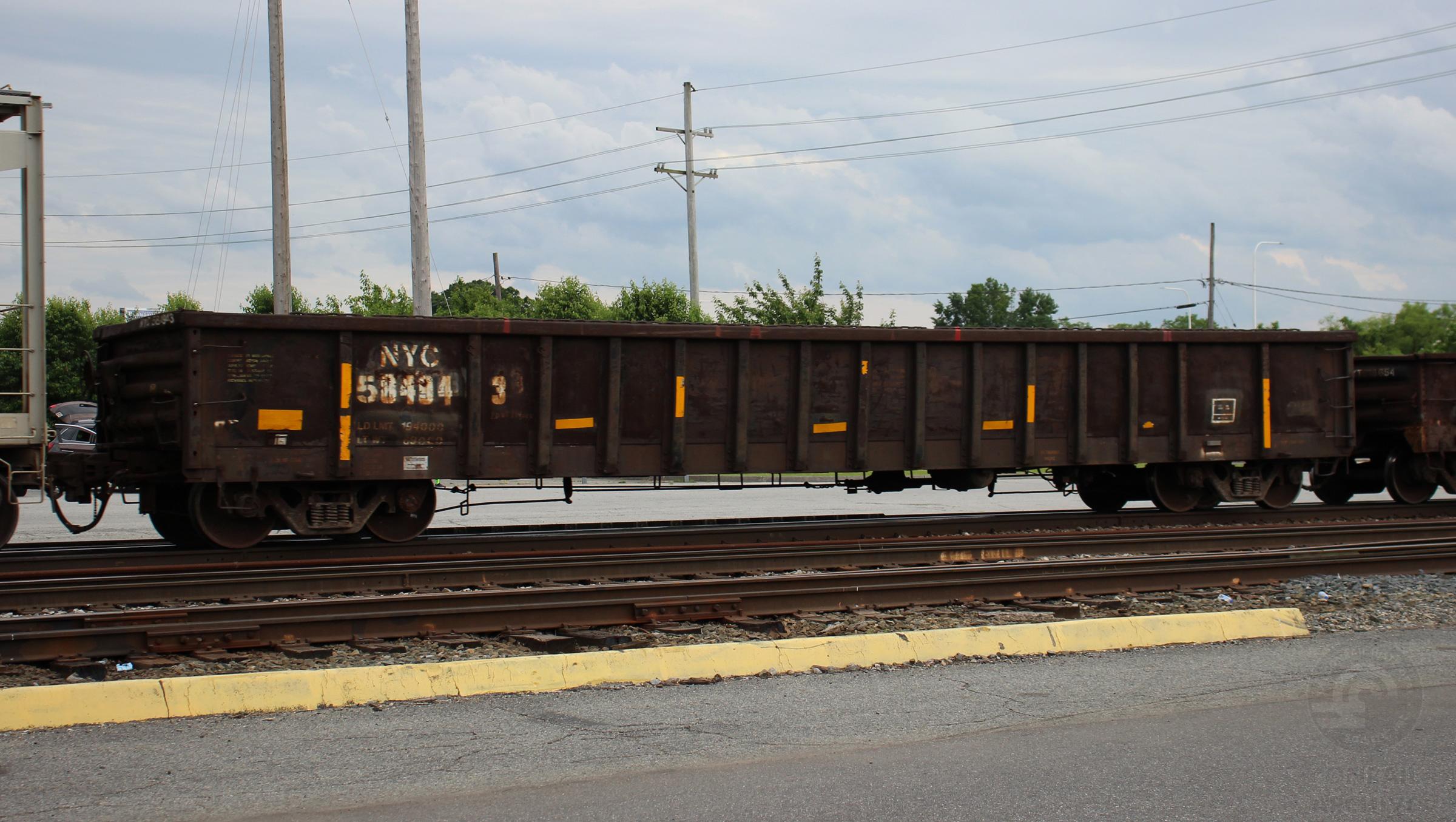 NYC 584943 is seen in the consist of CSX Q438-25 at Elsmere, DE on 5/26/19. Car is ex CR 584943/SB 6113 and was built 5-80.