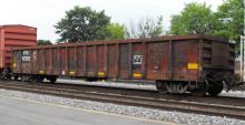 NYC 587355 is seen in CSX Q394-26 at Cumberland MD on 6/27/13. Car is ex CR 587355/CR 564273/PC 564273/NYC 720273 which was originally built as a NYC Lot 120G gon.