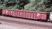 NYC 587895 is seen in loaded slab train PMT-11 at Johnstown, PA on 8/20/98. Car is ex CR 587895/CR 580352/PC 580352 and was built 12-71. Car was later restenciled to CSXT 915541 in April of 2012.