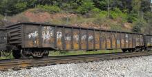 NYC 598572 is seen in PC paint on W951-08 at Cumberland MD on 8/11/12. Car is ex PC 598572 and was built 5-72 by Fruehauf.