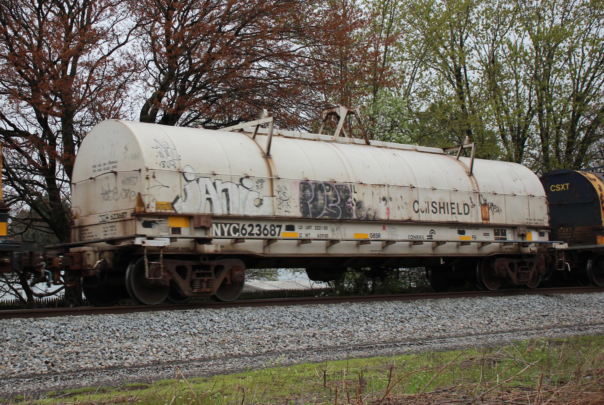 NYC 623687 is seen in the consist of CSX X410-10 at Newark DE on 4/5/21. Car is ex CR 623687 and was built 5-97 by Thrall as part of Job 989.