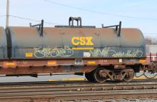 The right end of NYC 627245 is seen in the consist of CSX Q301-04 at Elsmere, DE on 3/5/16. Car is ex CR 627245/CR 752245/PC 752245 and was built 8-69.