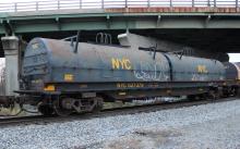 NYC 627379 is seen in the consist of CSX Q300-13 at Elsmere, DE on 12/14/15. Car is ex CR 627379/CR 752379/PC 752379, built 10-69 and was repainted CSX RA 4-02.