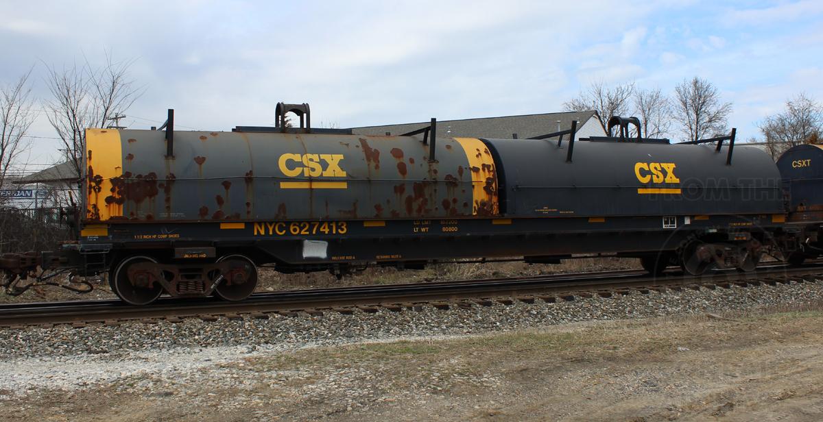 NYC 627413 is seen in the consist of CSX Q301-11 at Elsmere, DE on 3/12/16. Car is ex CR 627413/CR 752413/PC 752413, built 10-69 and was painted CSX RA 3-07.