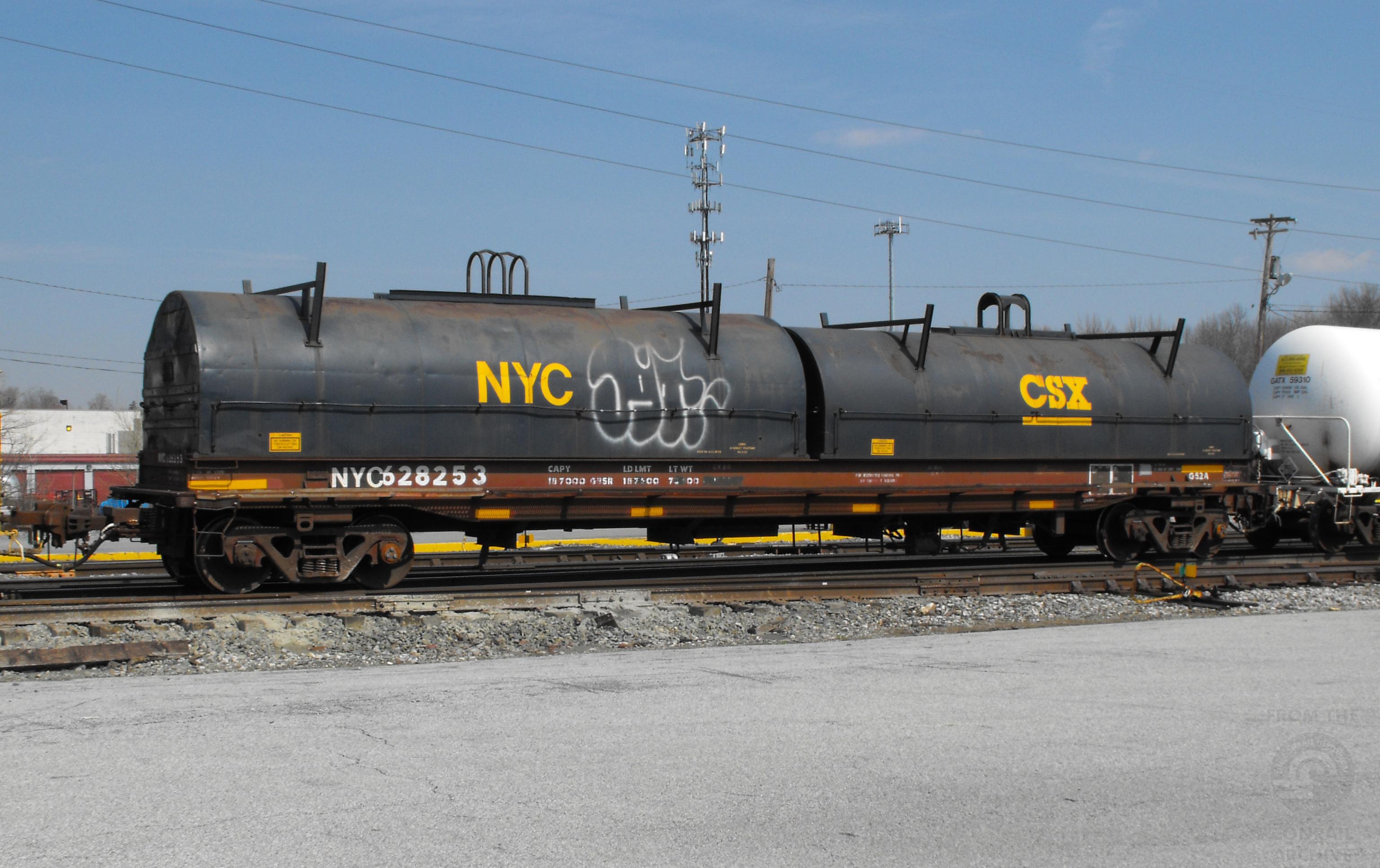 NYC 628253 is seen in the consist of CSX Q438-20at Elsmere, DE on 3/21/10. Car is ex CR 628253 and was built 11-77 by Thrall. It was deleted 4/7/17.