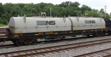 NYC 628364 is seen with a pair of NS coil hoods at Elsmere, DE on 8/1/16. Car is ex CR 628364, built 9-79 and was repainted CSX RA 5-02.