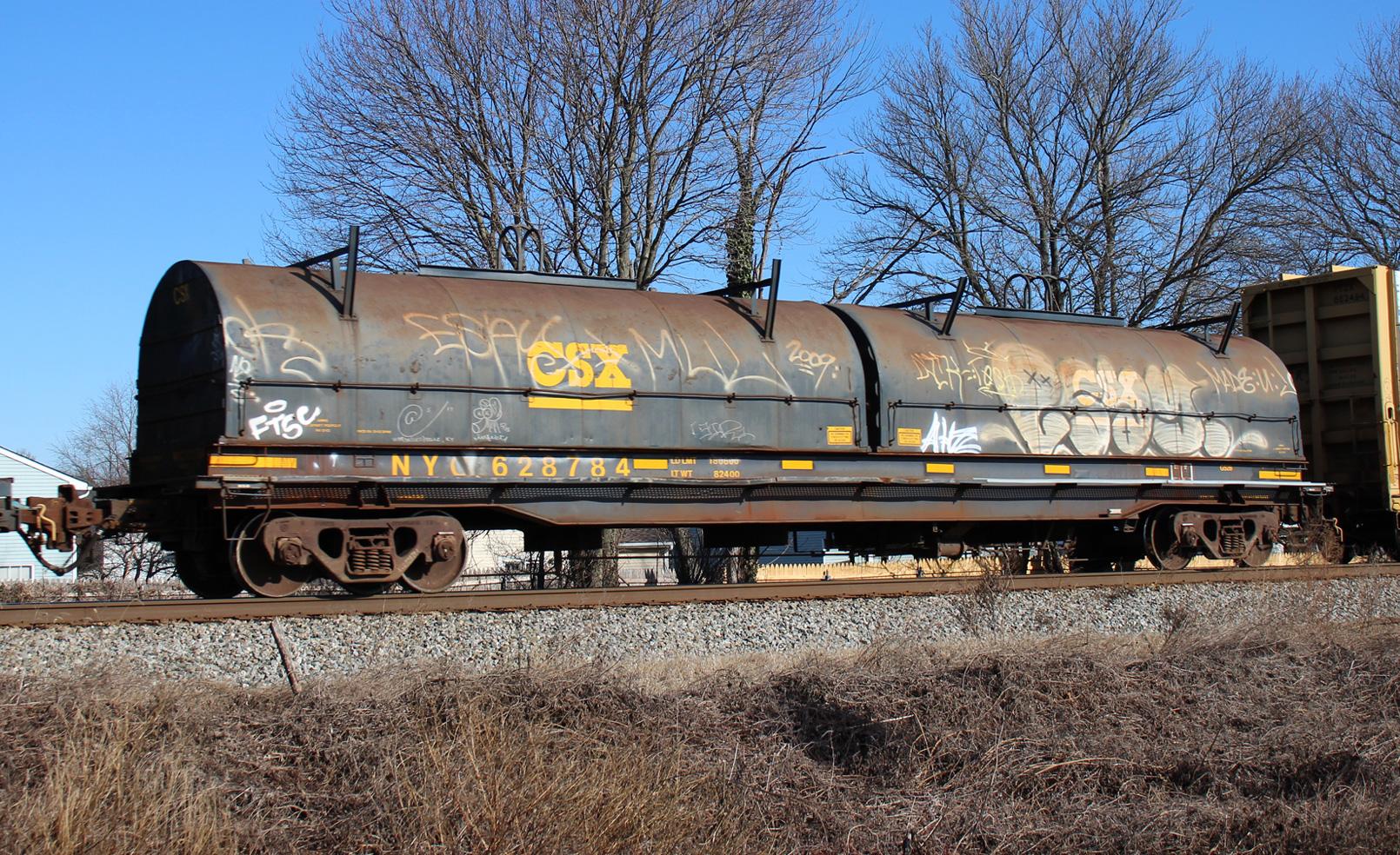 NYC 628784 is seen in the consist of CSX Q439-25 at Newark, DE on 1/26/20. Car is ex CR 628784, built 5-80 by Portec and was painted CSX 8-00 FGE.