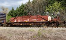 NYC 631072 is seen in the consist of CSX Q409-10 at Newark, DE on 4/11/20. Car is ex CR 631072 and was built 10-92 by Thrall. Photo by Chris Carangi.