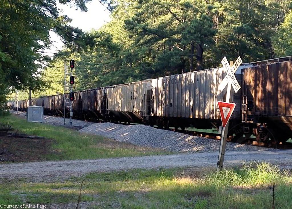 CSXT CW44AC 146 pulls a line of covered hoppers, including Conrail H54 class NYC 889788, southbound past N.E. Aberdeen signal in Tyrone, GA on August 29, 2014.