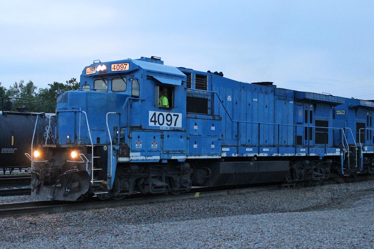 Former NS 4097/CR 2037/MGA 2307/WP 2262(U23B) is on the point of an Ohio Central job heading south out of Zanesville, OH in the late evening, with a quartet of Super 7's.