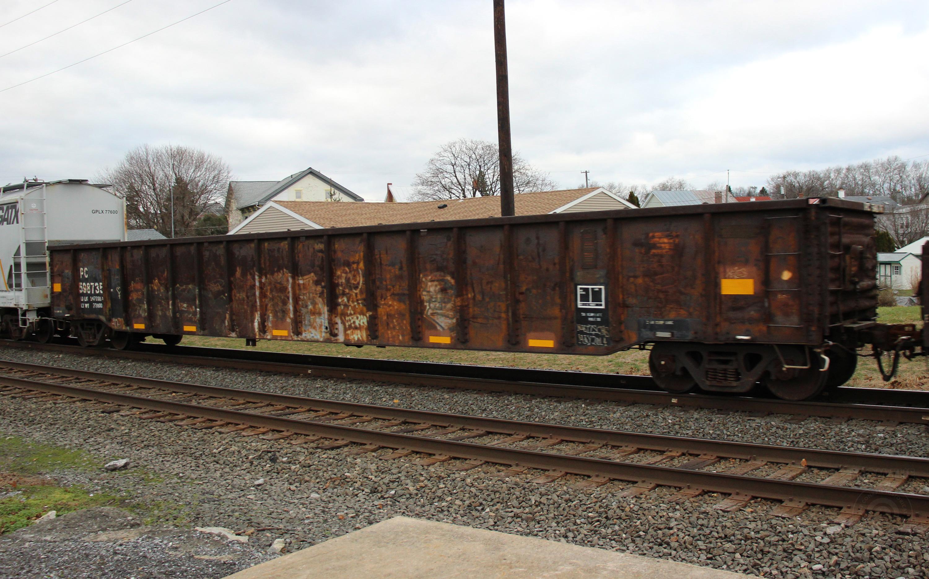 PC 598735 is seen in the consist of NS 15T at Richland, PA on 12/22/18. Car was built 5-72 by Fruehauf.