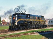 After cosmetic restoration, PRR/PC/CR 4859 GG1 appears ready for its trip to Harrisburg to be "enshrined" under the train shed at the Harrisburg Amtrak Station (aka Harrisburg Transportation Center) on November 15, 1986. PRR 4859 pulled the first electrically powered train into Harrisburg on January 15, 1938. Smoke in the background was from a returning Strasburg Rail Road double-header steam excursion with PRR 7002 & PRR 1223 to Harrisburg on Amtrak's Keystone Corridor, including running on Conrail's Pittsburgh Line up to Rockville Bridge to turn on the east end wye.