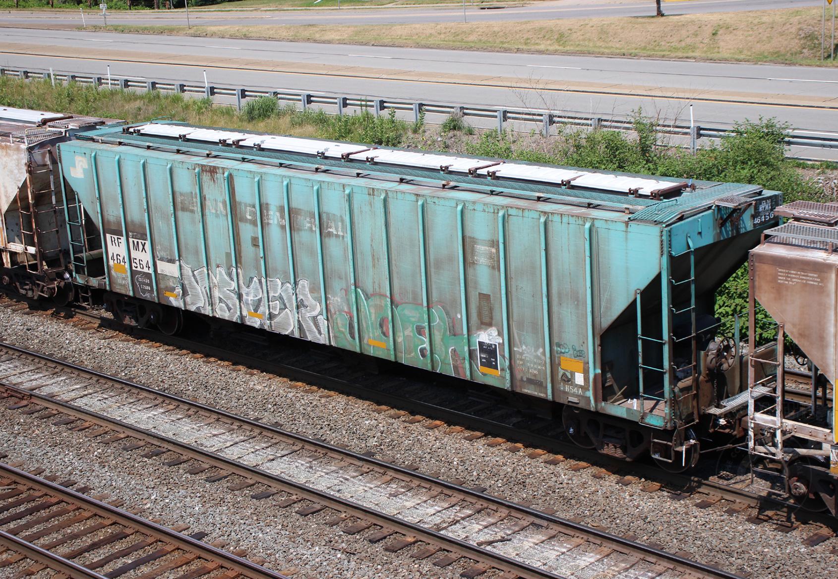 RFMX 464564 is seen in the consist of NS 10G at Baden (East Conway), PA on 7/9/20. Car is ex BN 464564/RFMX 890007/CR 890007/PC 890007 and was built 7-72 by P-S. Photo by Chris Carangi.