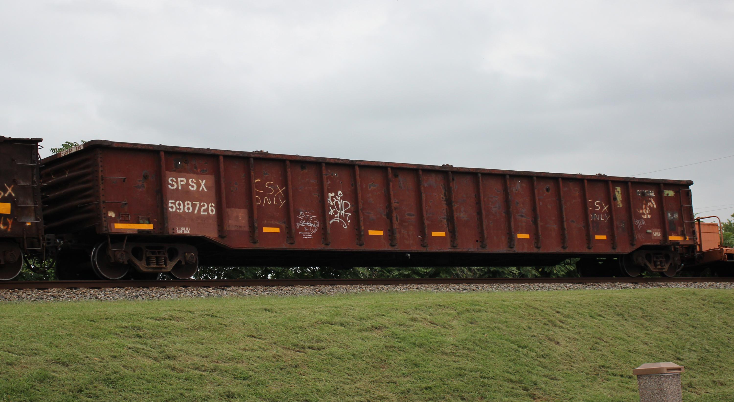 SPSX 598726 is seen in the consist of CSX Q439-26 at Newark, DE on 9/27/20. Car is ex CR 598726/PC 598726 and was built 5-72 by Fruehauf.