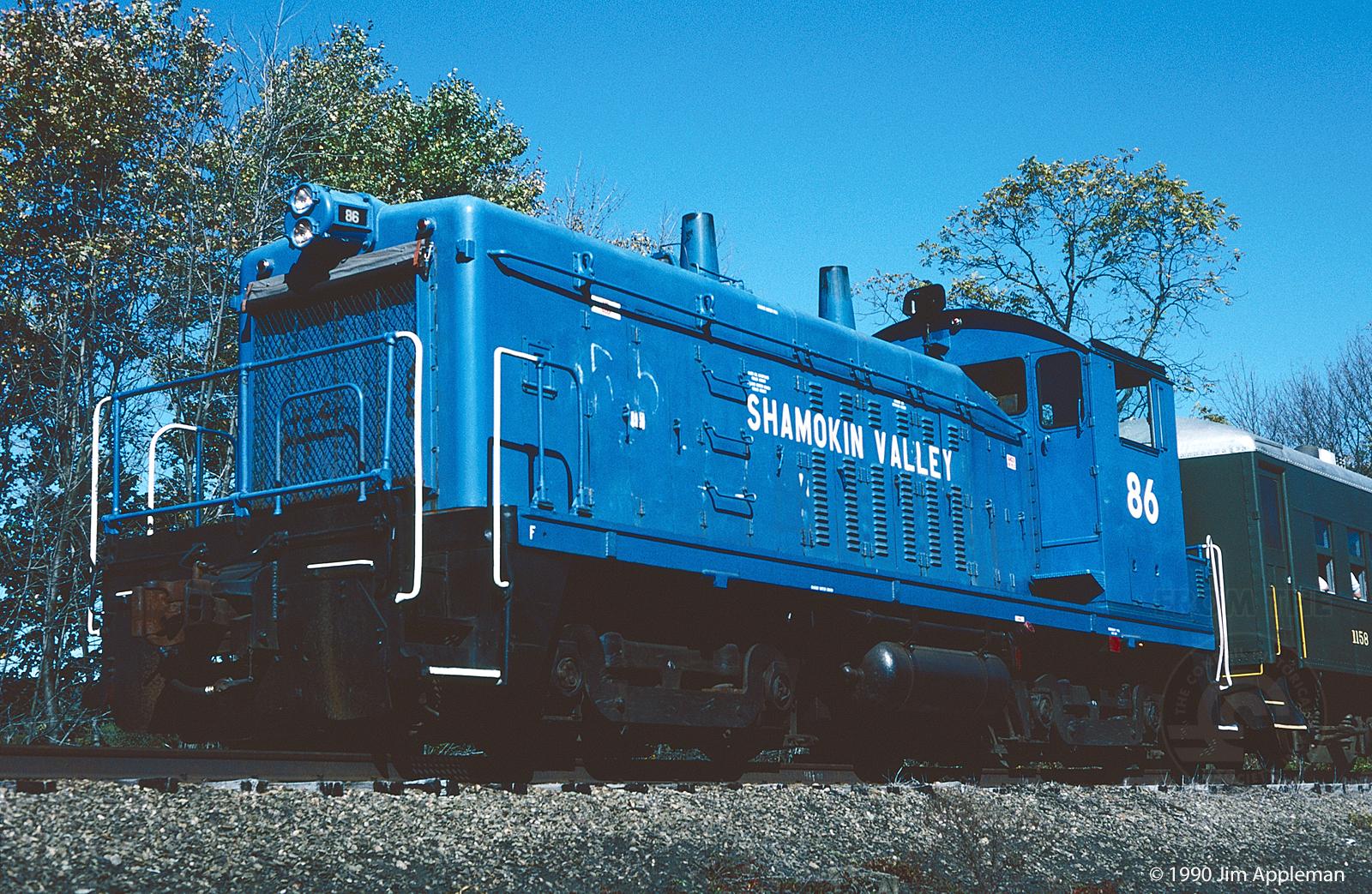 Shamokin Valley Railroad of the North Shore Railroad Company ran excursions from Sunbury to Shamokin and return on October 6 & 7, 1990 using SVRR 86 SW7, nee-CNJ 1081, ex-CR 8869.