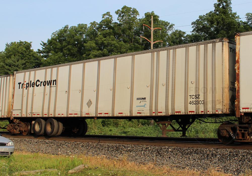 Previous Next Photo By Chris Carangi TCSZ 462303 is seen in the consist of NS I62 at Wyomissing, PA on 8/16/14. Trailer was deleted 6/13/16 by NS. Equipment Type Roadrailers Post Conrail Owner Norfolk Southern Year 2014 Original Date 8/16/14 Collection CRHS Conrail Photo Archive Contributions