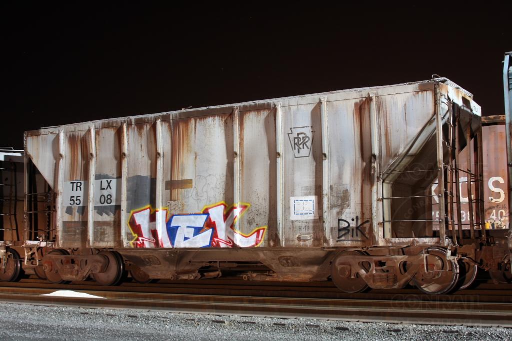 TRLX 5508 still in its PRR paint, poses for a night shot at Enola, PA on 11/23/09. Car is loaded with frac sand used in the extraction of natural gas from ground sources and was on its way to Williamsport, PA.