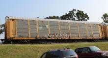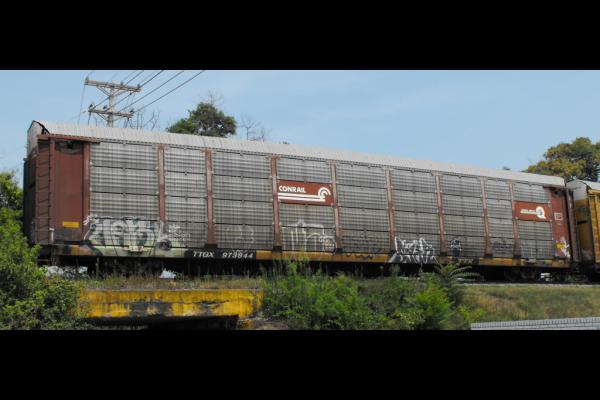 TTGX 156724 is seen in the consist of CSX Q217-04 at Newark, DE. Rack was built as CR 8364, a CR ML2L class rack, in 5-90 and was rebuilt, repainted and renumbered to NS 27288 in 6-06. Rack is now classed FB548 by NS.
