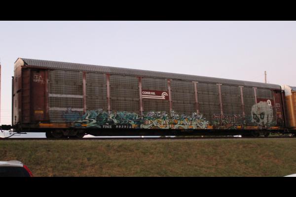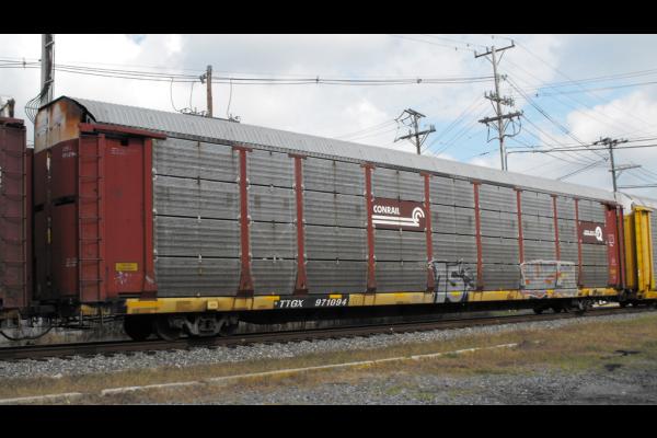 TTGX 156829 is seen in the consist of CSX Q217-17 at Newark, DE on 2/17/10. Rack was built as CR 8015, a CR ML2L class rack, in 3-90 and was rebuilt, repainted and renumbered to NS 27359 in 10-08. Rack is now classed FB548 (mis-stenciled FT648) by NS.