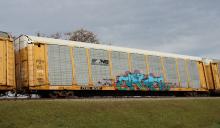 TTGX 157237 is seen in the consist of CSX Q217-02 at Newark, DE on 1/2/22. Rack was built as CR 8411, a CR ML2L class rack, in 6-90. It was then rebuilt, repainted and renumbered to NS 29866 in 9-19. Rack is now classed FB548 by NS.