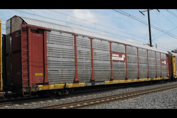 TTGX 157331 is seen in the consist of CSX Q217-03 at Newark, DE on 9/3/17. Rack number is CR 6818, built 10-88, rebuilt 1-96 and is now owned by NS.
