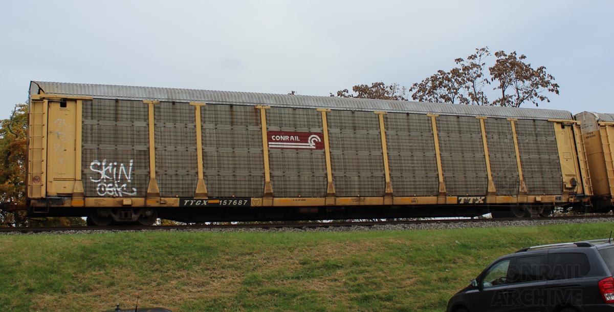 TTGX 157687 is seen in the consist of CSX L217-01 at Newark, DE on 11/1/15. Rack number is CR 8448, built 5-90, rebuilt 3-98 and is now owned by NS.