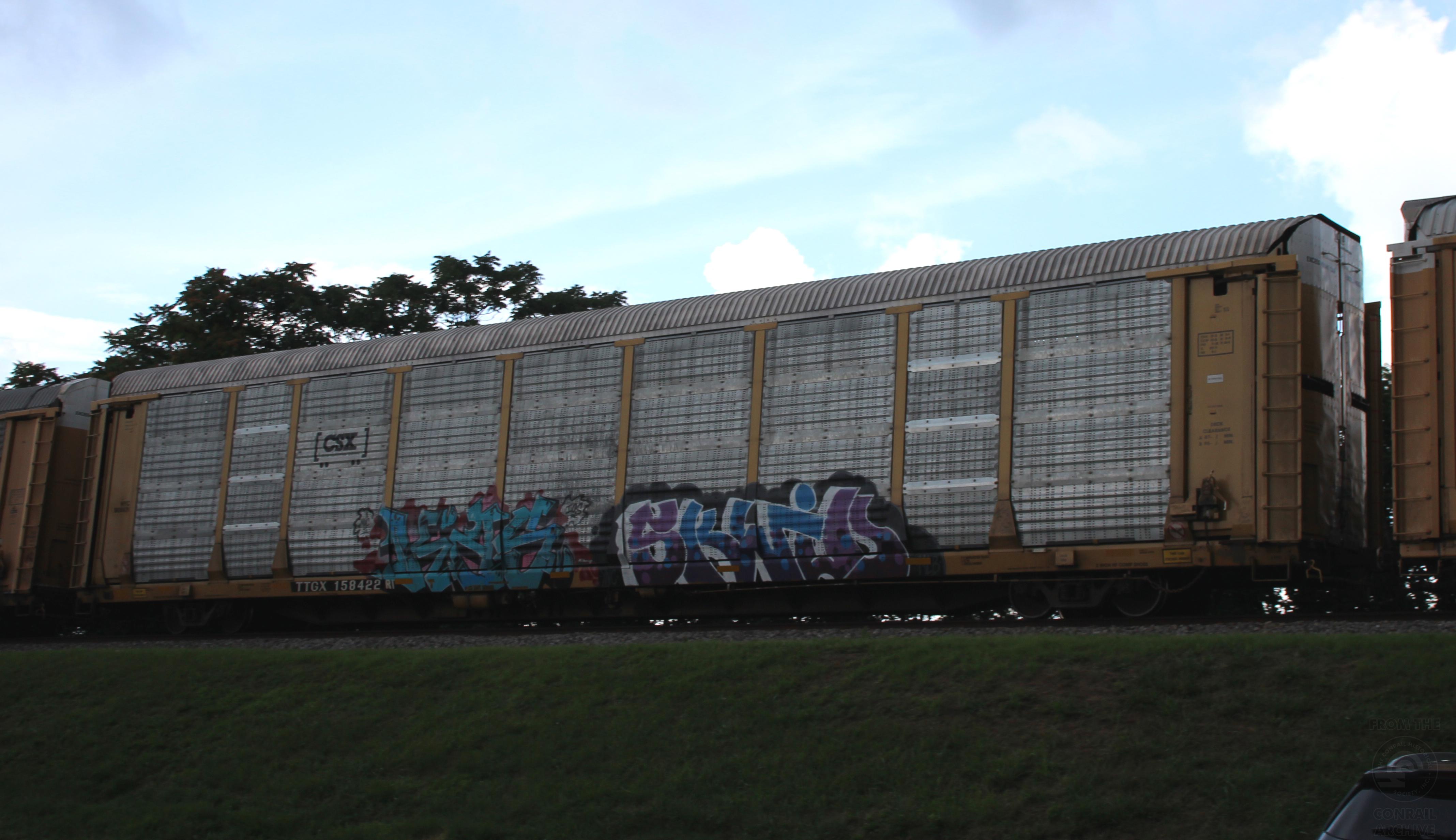 TTGX 158422is seen in the consist of CSX X216-02 at Newark, DE on 7/3/23.Rack was built as CR 8471, a CR ML2L class rack, in 6-90 and was originally rebuilt and repainted yellow in 9-98. It was then rebuilt, repainted and renumbered to NYC B08471 in 3-20 by THCG as part of Recert Job C1013.