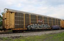 TTGX 159002 is seen in the consist of CSX Q276-14 at Cumberland, MD on 6/15/16. Rack number is CR 8120, built 4-90, rebuilt 2-98 and is now owned by CSX.