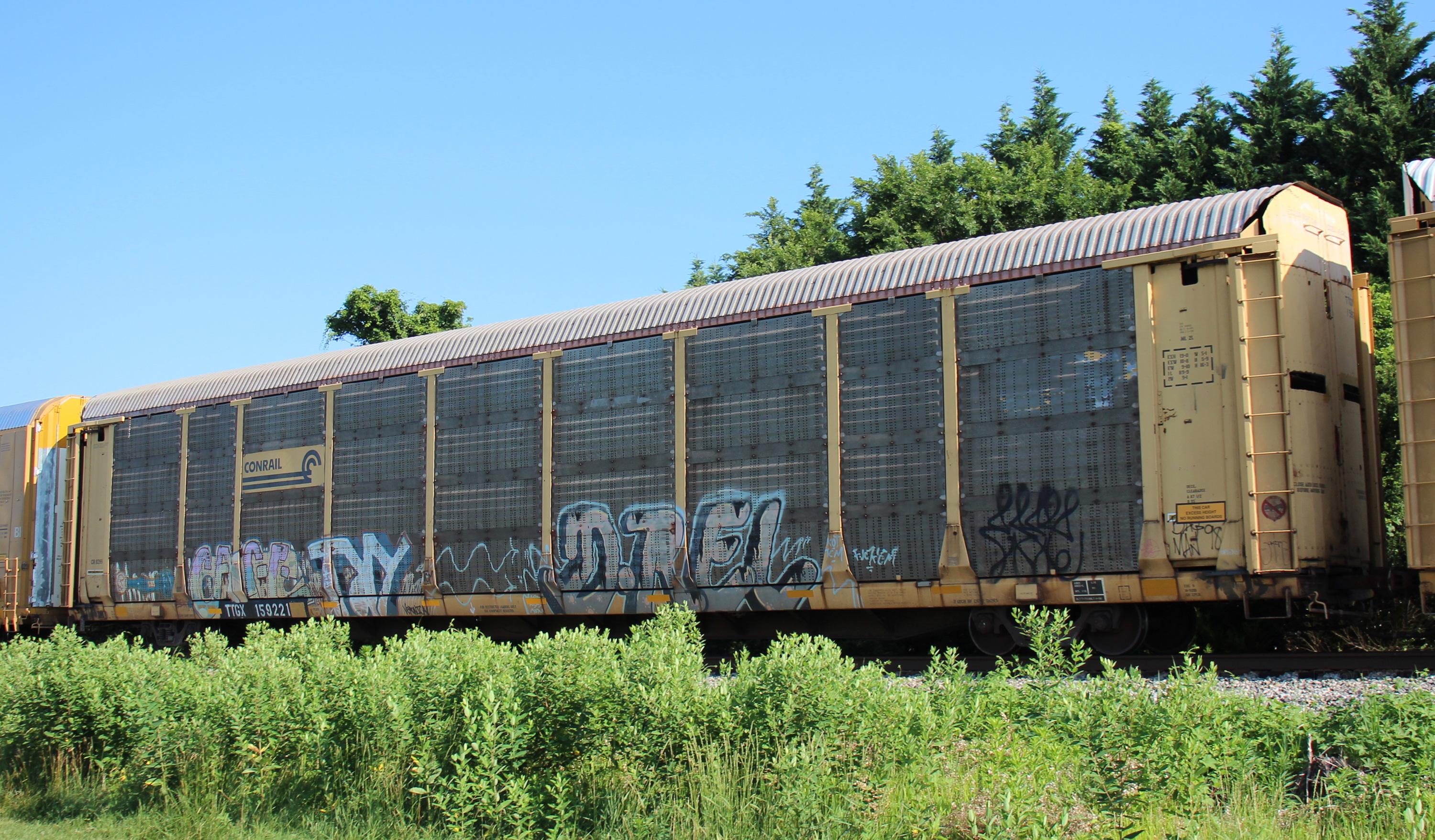TTGX 159221 is seen in the consist of CSX Q217-30 at Newark, DE on 6/30/18. Rack number is CR 8399, built 4-90, rebuilt 1-98 and is now owned by CSX. Note the rack has black Conrail lettering.
