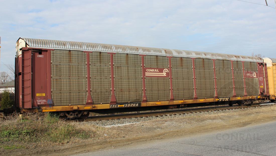 TTGX 159264 is seen in the consist of CSX Q216-10 at Elsmere, DE on 12/12/15. Rack number is CR 7590, built 1-89, rebuilt 3-97 and is now owned by NS..