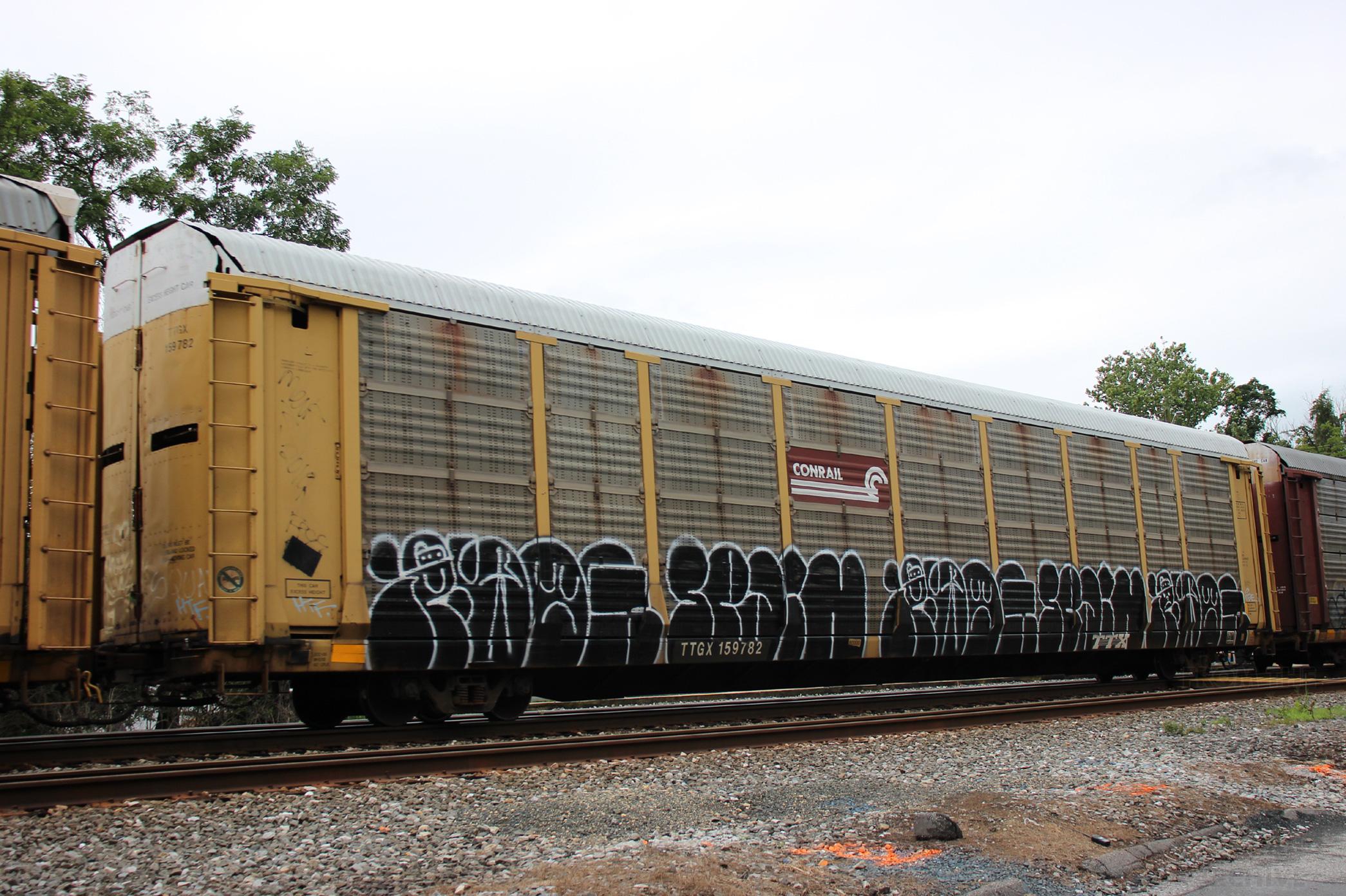 TTGX 159782 is seen in the consist of CSX Q216-13 at St. Denis, MD on 8/16/20. Rack number is CR 8560, built 6-90, rebuilt 9-98 and is now owned by NS. Photo by Chris Carangi.