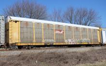 TTGX 159789 is seen in the consist of CSX Q216-20 at Newark, DE on 2/22/20. Rack number is CR 8418, built 6-90, rebuilt 3-98 and is now owned by NS.
