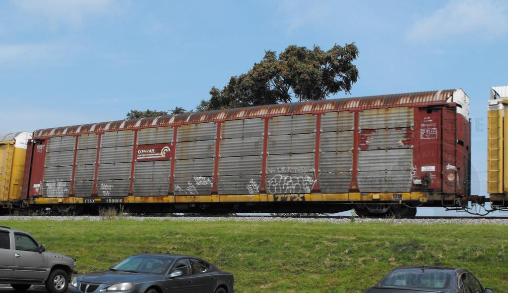 TTGX 159806 is seen in CSX Q216-29 at Newark DE on 8/31/13. Rack number is CR 6069, built 6-87 and is now owned by CSX.