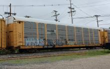 TTGX 159967 is seen in NS paint in the consist of CSX Q217-15 at Newark, DE on 7/15/14. Rack was built as CR 8321 in 5-90 and then rebuilt, repainted and renumbered to NS 27638 in 6-07. Rack is now classed FB548 by NS.