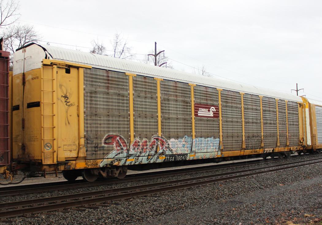 TTGX 160478 is seen in the consist of NS 11J at Wyomissing, PA on 3/25/16. Rack number is CR 8460, built 6-90, rebuilt 2-98 and is now owned by NS.